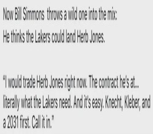 据NBA名嘴比尔·西蒙斯的原话,如果他是湖人管理层,他会想交易得到赫伯·琼斯。