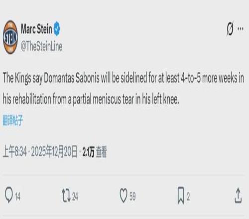 但天有不测之风云,今天据NBA名记马克·斯泰恩报道,国王官方透露,小萨博尼斯出现了左膝的半月板部分撕裂,至少要再缺阵4到5周的时间。